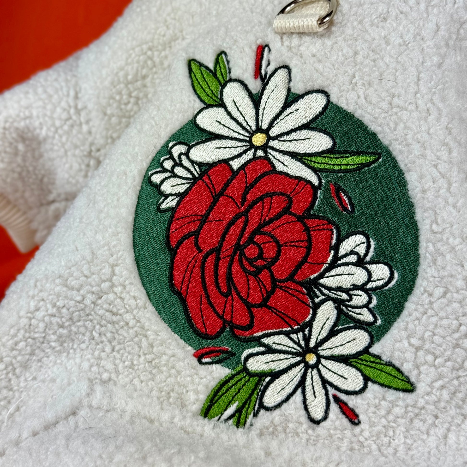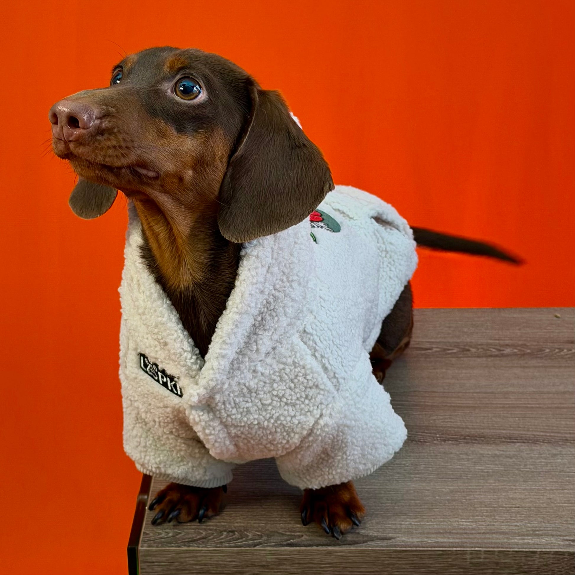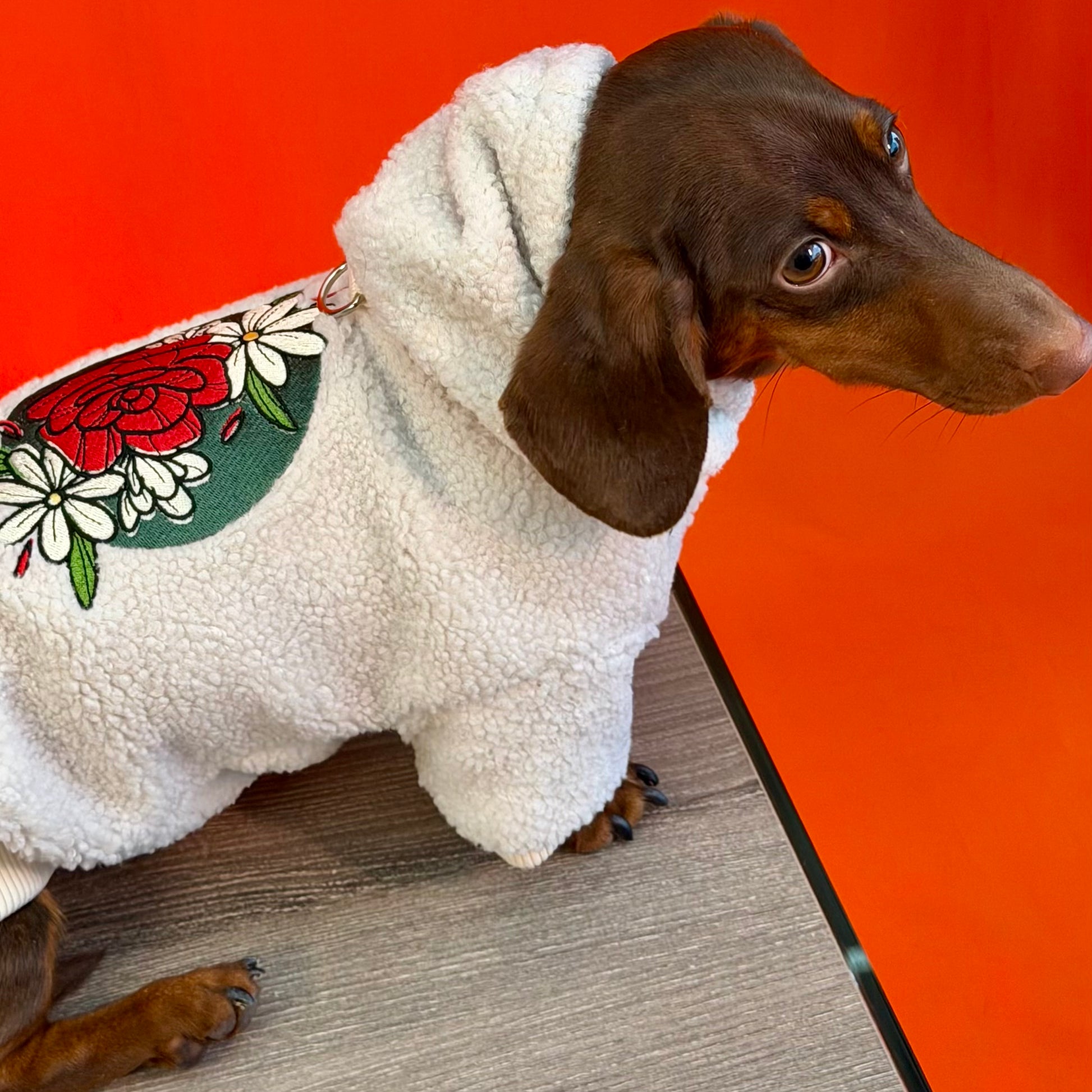 Our Pups n’ Roses sherpa hoodie blends comfort with artistry. Crafted from plush fleece and finished with detailed rose and daisy embroidery, it’s the perfect statement piece for pups who love to stay warm and stylish.