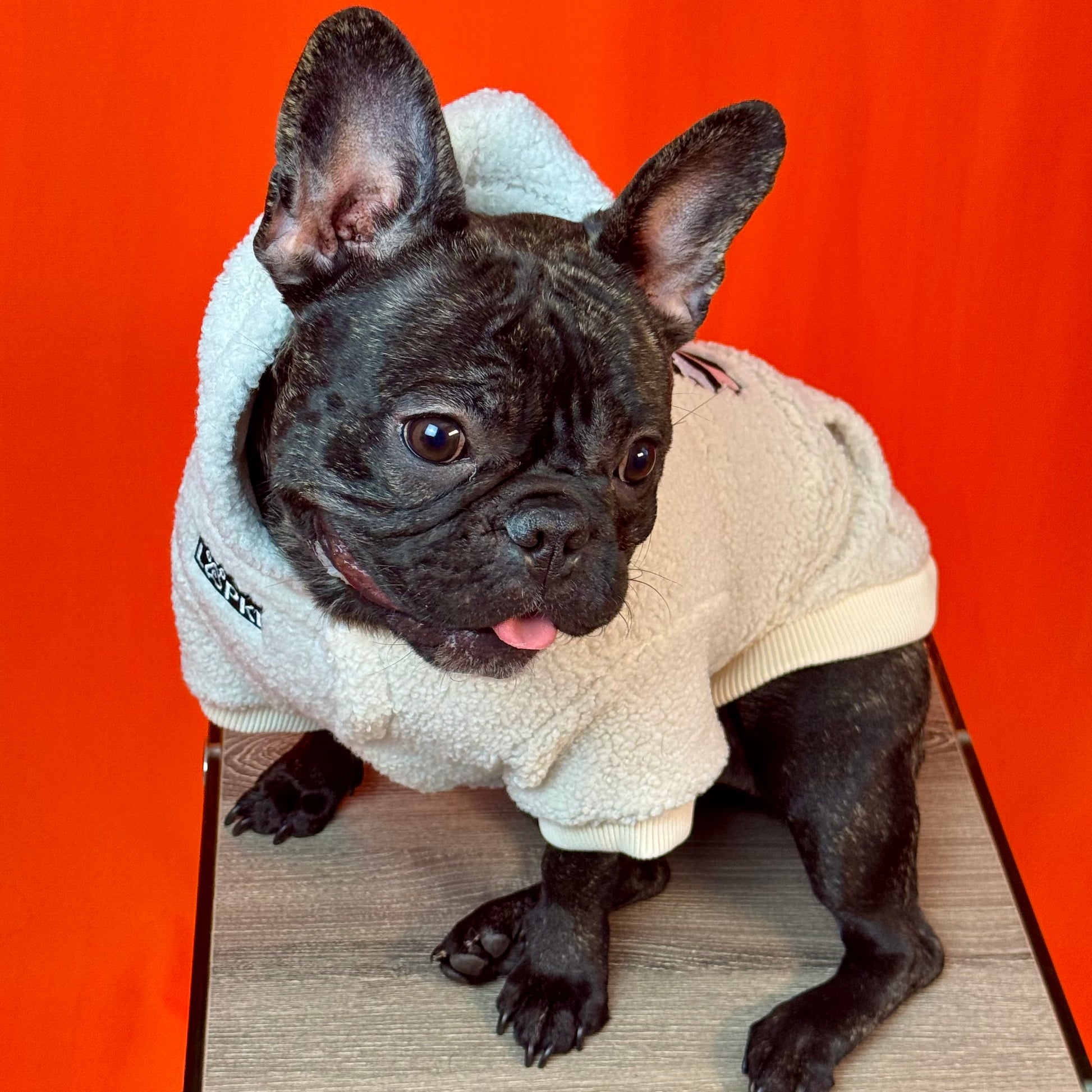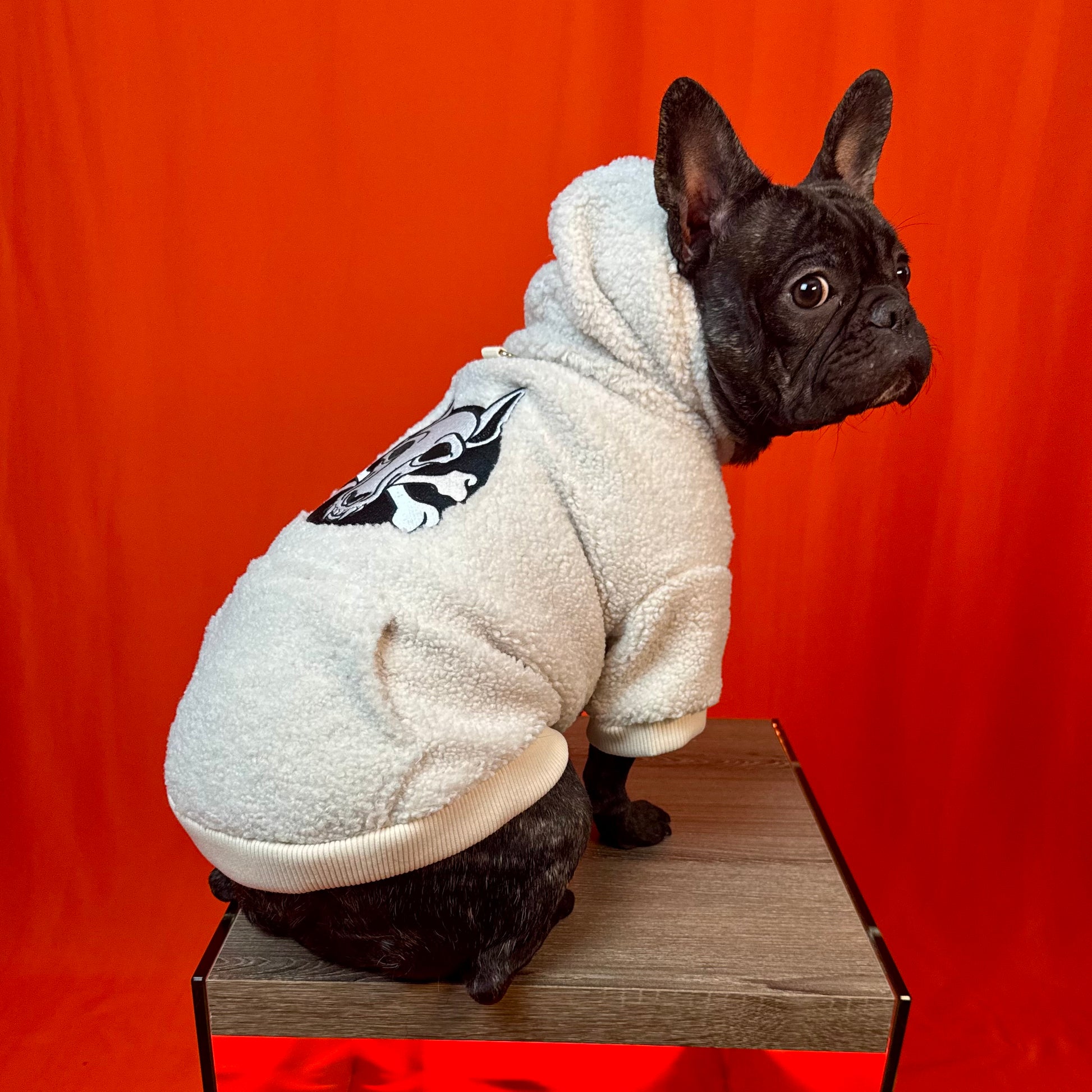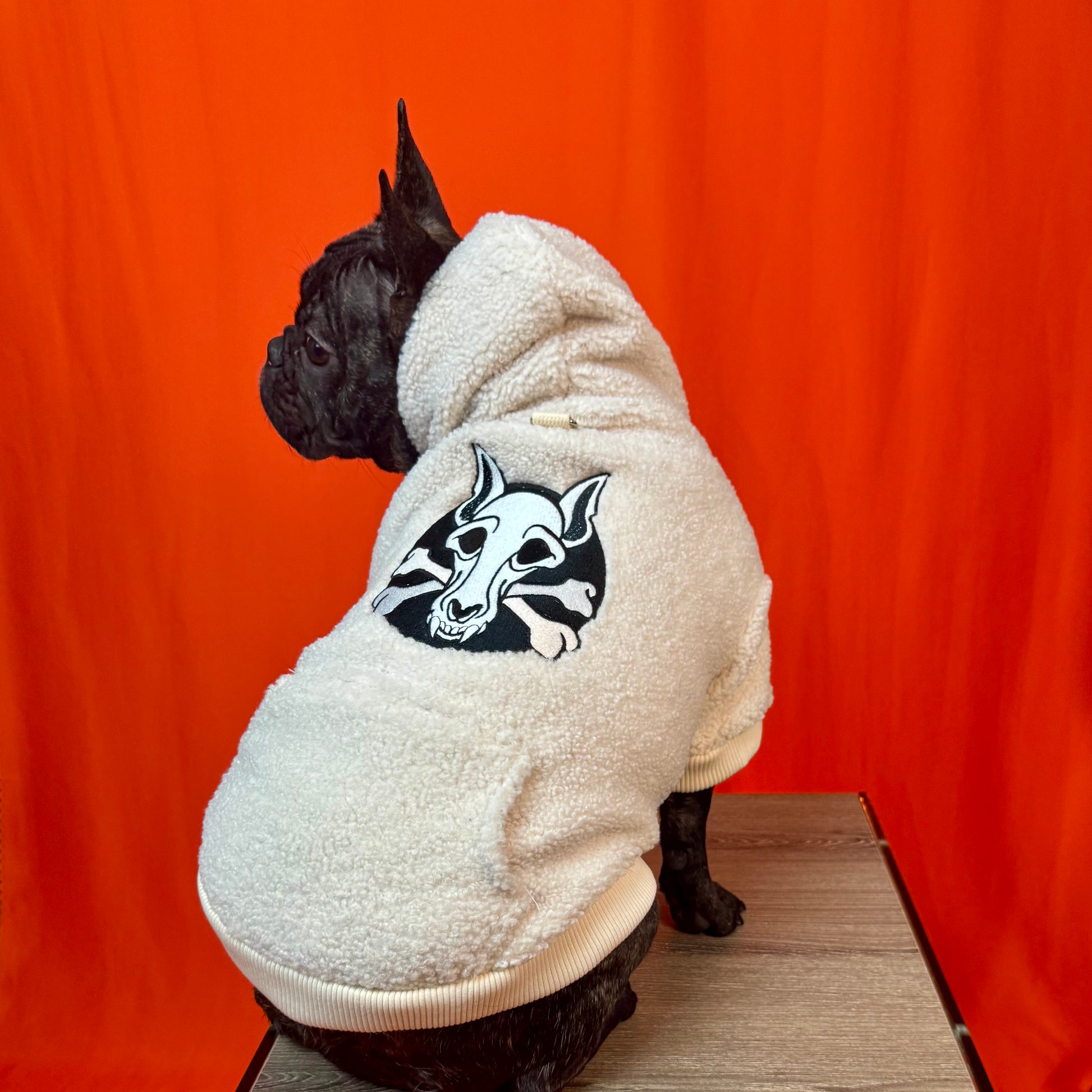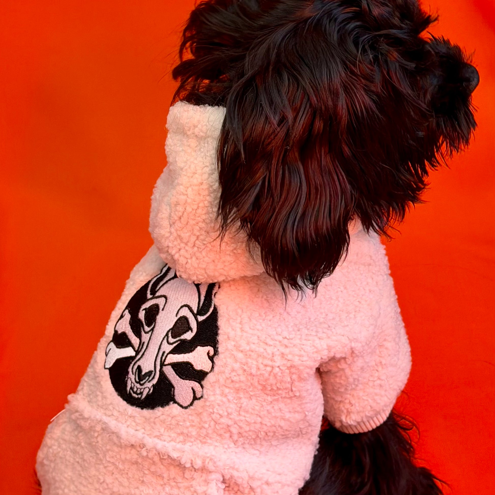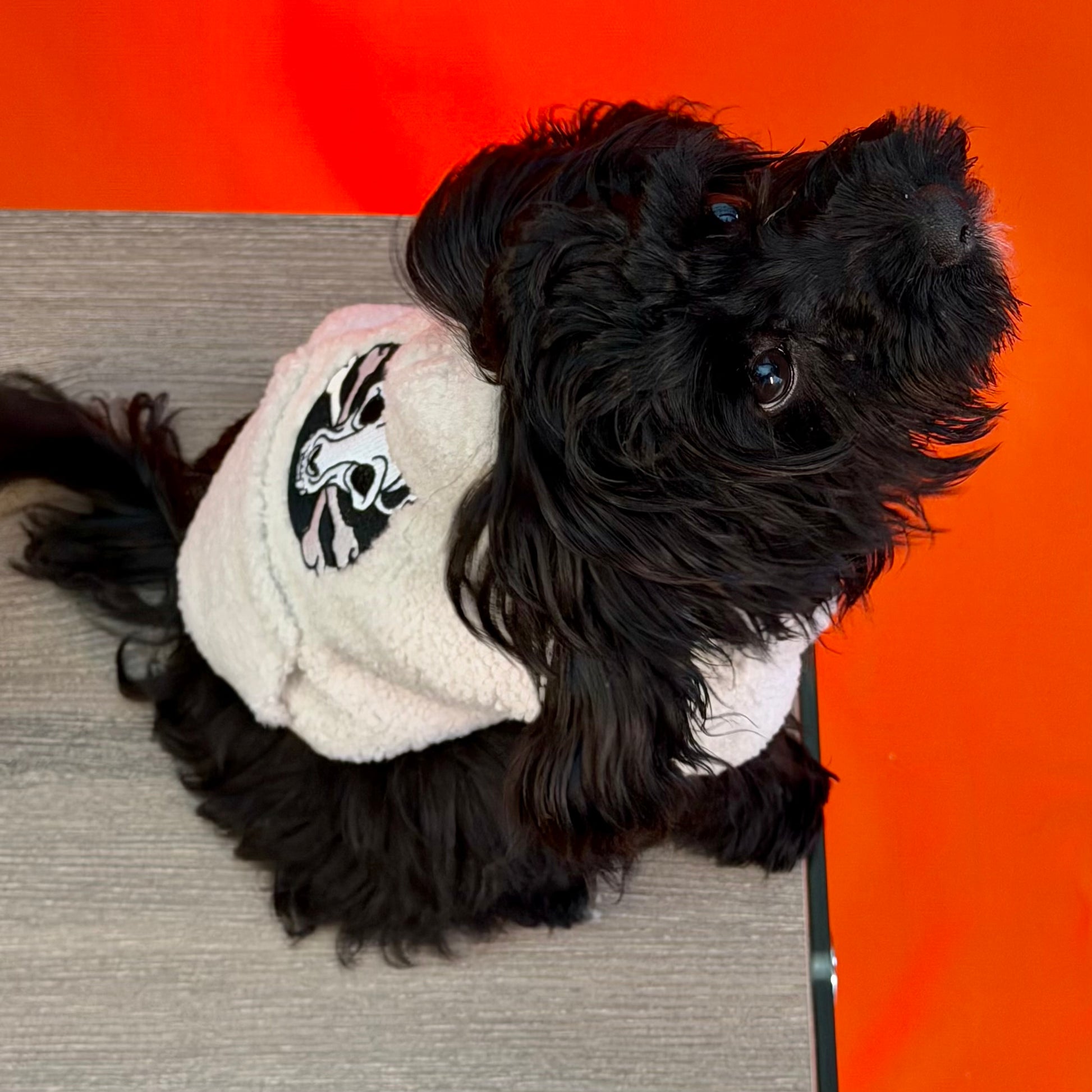 Our Trick and Treat sherpa hoodie blends comfort with playful charm. Crafted from plush fleece and finished with detailed, bold embroidery, it’s the perfect statement piece for pups who love to stay warm and edgy.
